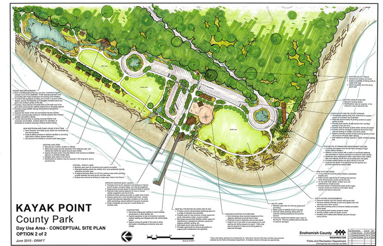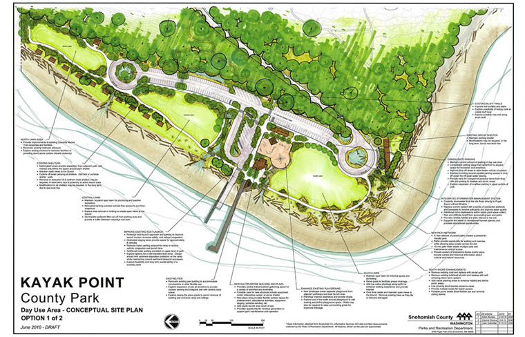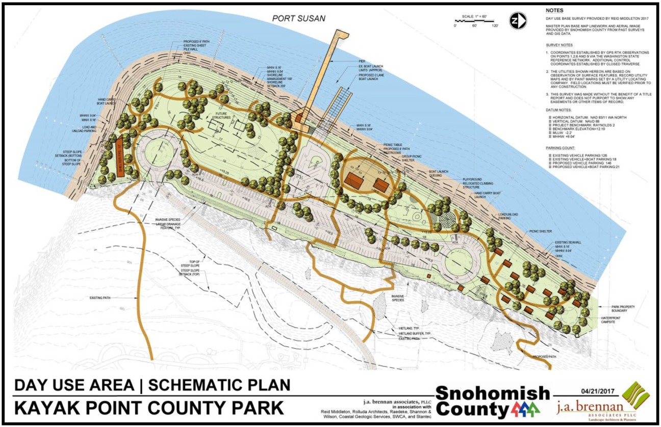 Snohomish County has been using these ideas to inform the design as the County prepares for construction at the Park. The current plan (see schematic below) calls for reconfiguring the day-use area, which will provide additional recreation space. Parking will be moved away from the shoreline, and the boat launch will be improved with habitat improvements. As part of implementing these changes, park infrastructure will be replaced (e.g. failing water lines and buckling asphalt) and the park will be positioned for many more years of enjoyment. 60% design has been completed and 90% design is underway. It is planned that the project will be constructed in a series of phases, due to the overall cost of the project. Grant funds are being sought currently and, if successful, the first phase of construction is set to start in 2021.