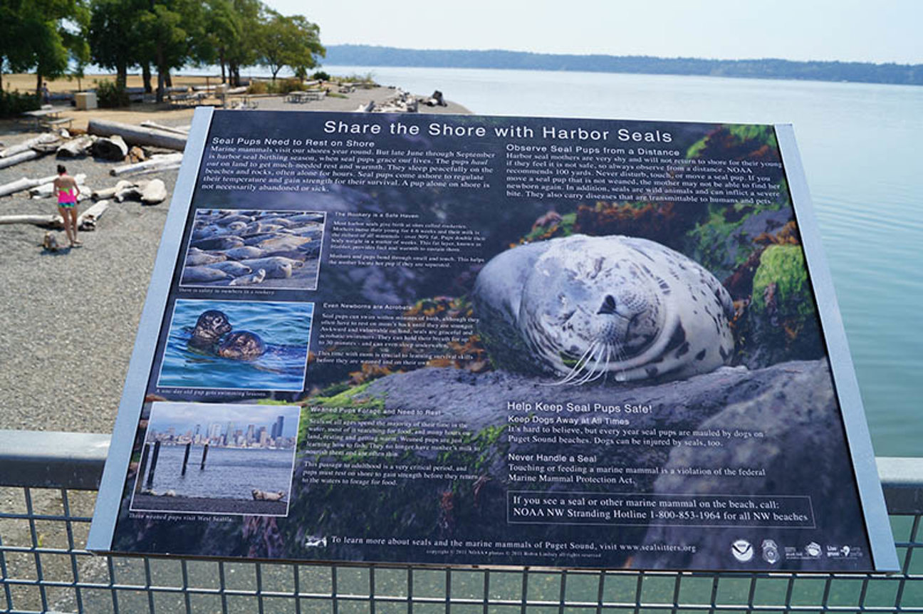 In Winter 2012, the Snohomish County MRC funded the purchase of nine NOAA Marine Mammal Stranding Network signs. The signs provide information about how to “Share the Shore with Harbor Seals” in order to best protect and view the mammals at a safe distance. In partnership with Snohomish County WSU Extension Beach Watchers, the signs were installed in 2013 and can be viewed at the following locations: