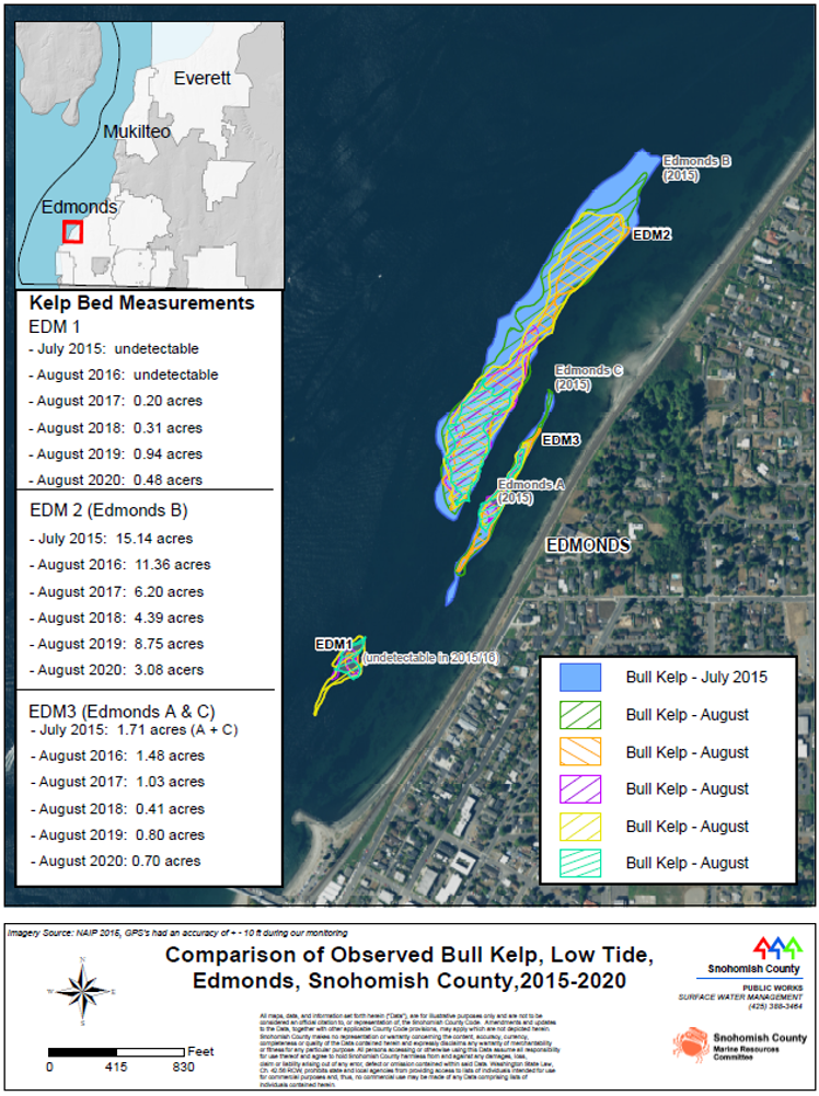 For more information on the 2021 Marine Vegetation Monitoring of South Snohomish County, view the full report here: Eelgrass, kelp, and other macroalgae in South Snohomish County - Final report to Snohomish County