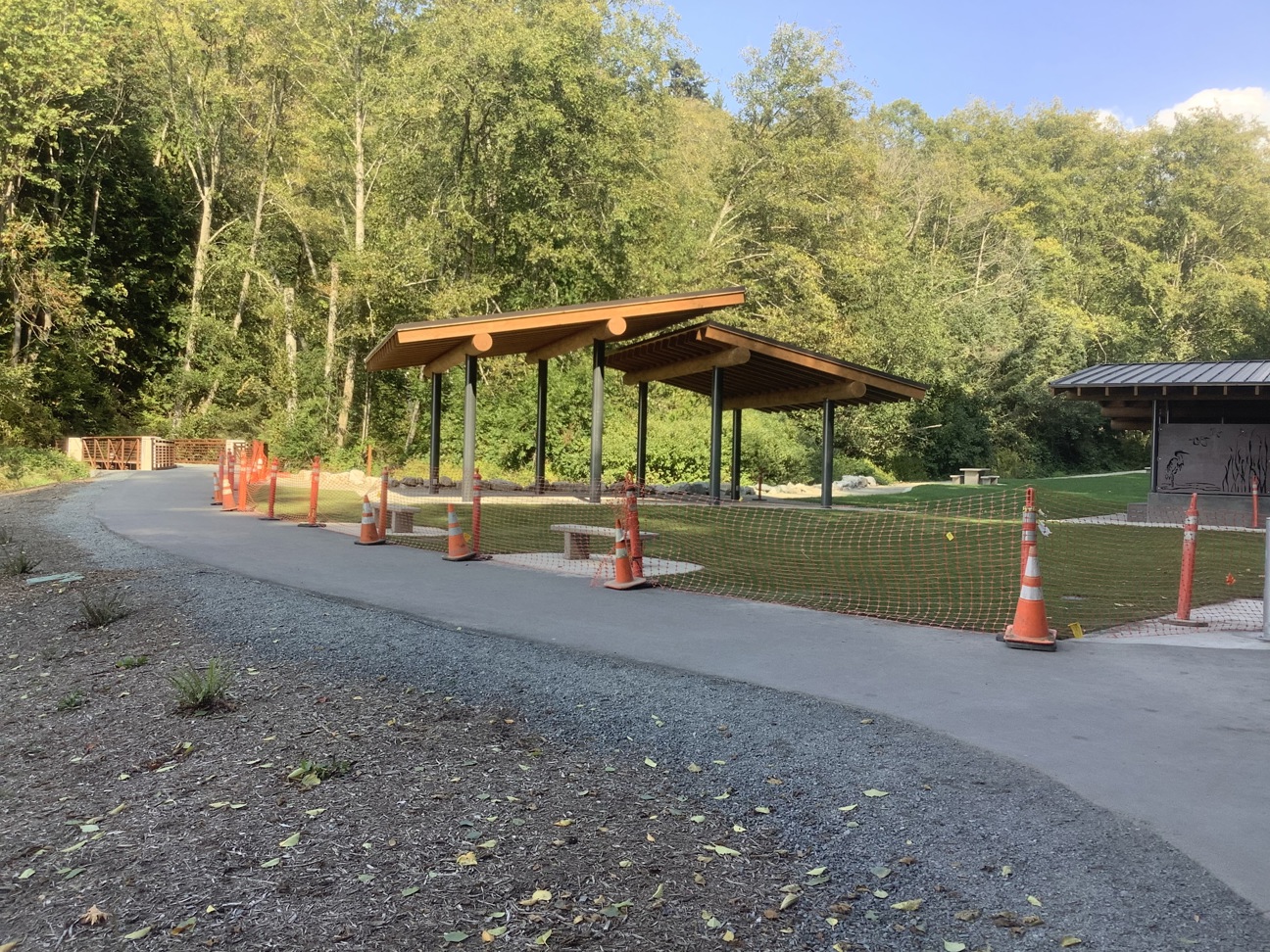 New pedestrian bridge (far left), picnic shelter (left), restroom enclosure (right), and improved lawn during construction.