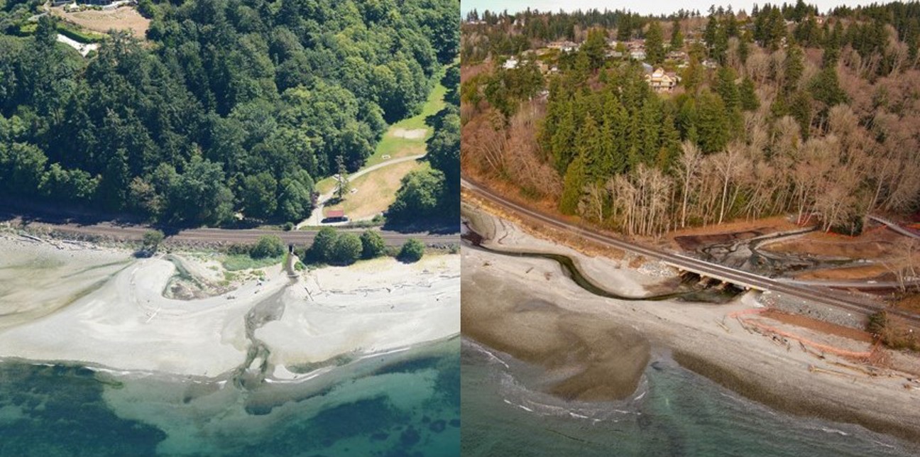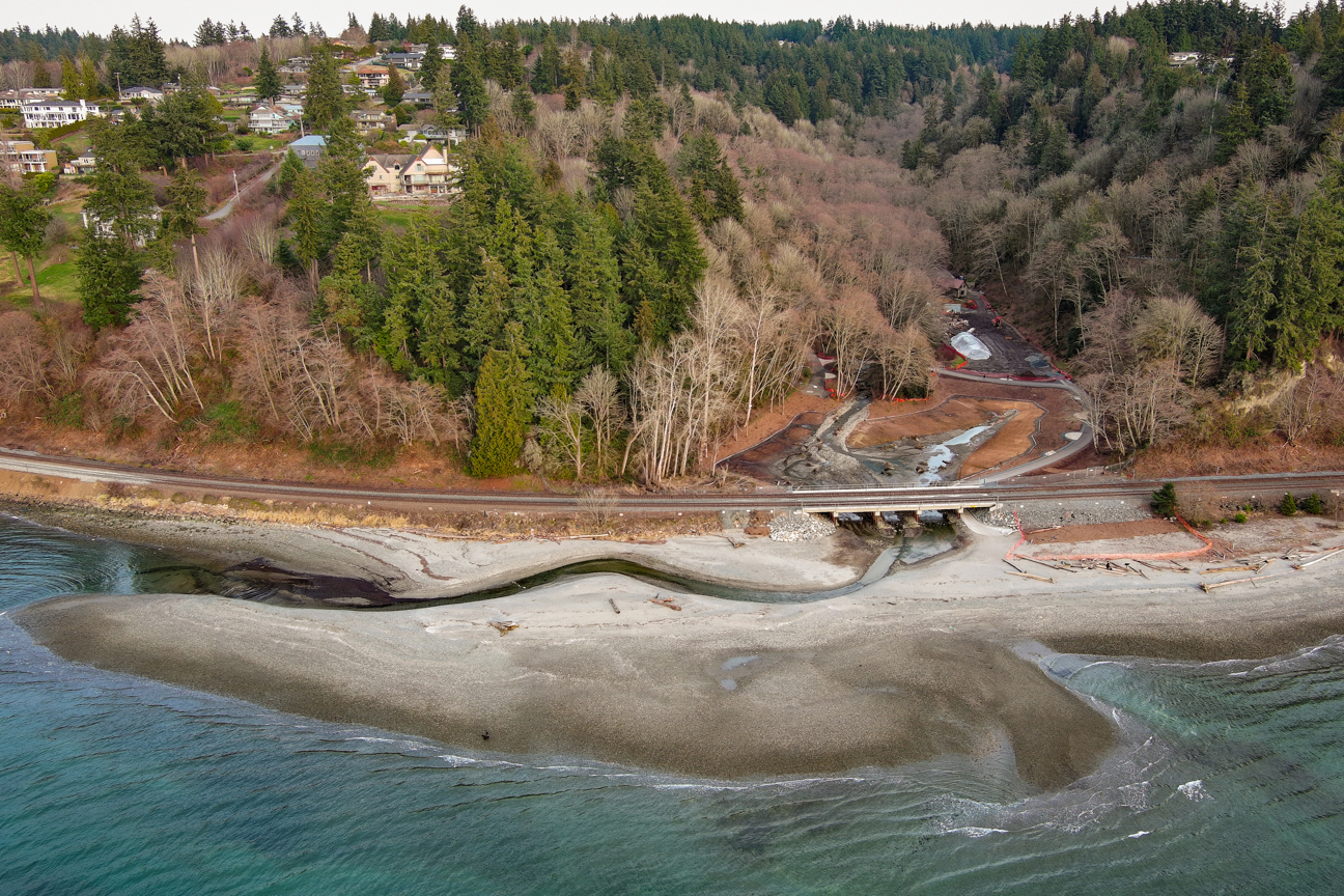 The Meadowdale Beach and Estuary Restoration Project replaced 128 linear feet of BNSF's two-tracked, rock armored railroad embankment and the associated 6-foot wide box culvert, with a five-span railroad bridge and fencing to protect public safety and restore shoreline processes associated with Puget Sound.