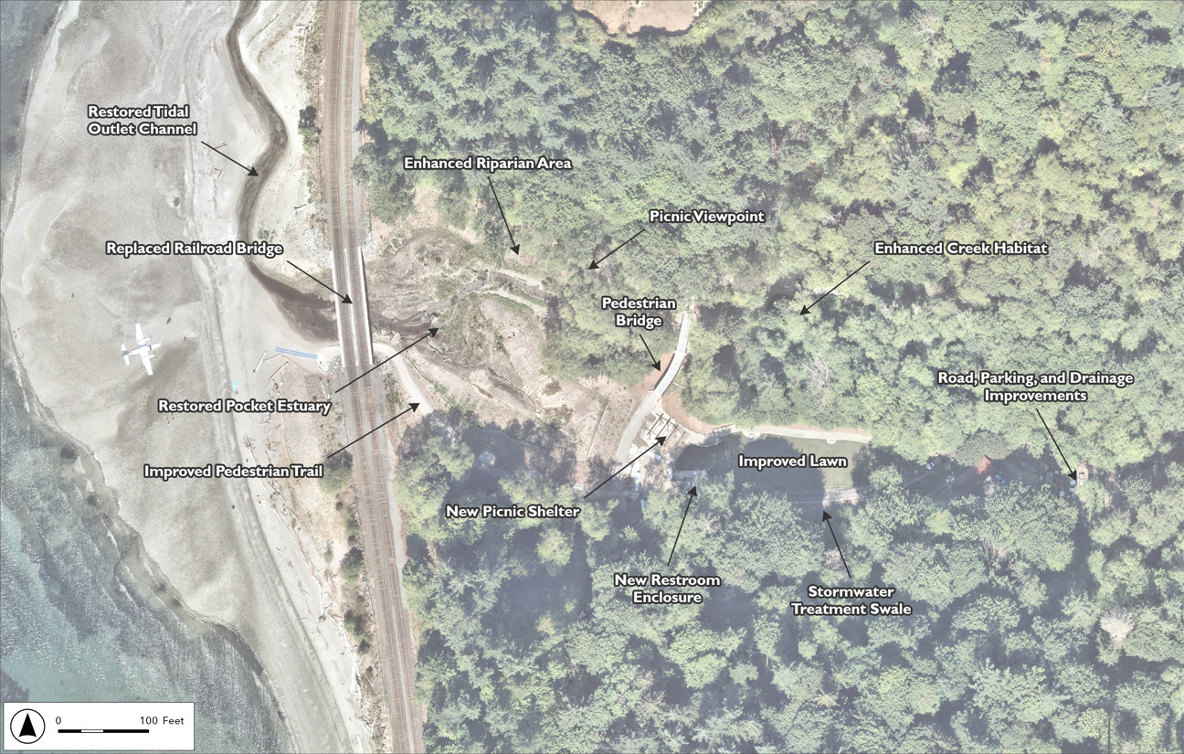 The project is the first Puget Sound shoreline restoration constructed that included enlarging a stream crossing under the railroad tracks along the shoreline. The installation of a wide railroad bridge to replace the undersized culverts was critical to Snohomish County Parks achieving its vision to convert park lawn areas to high functioning estuarine habitat to benefit salmon. The cooperation of BNSF and coming together of multiple interested parties was integral to the project's success. The project represents a win-win through its multiple benefits to salmon restoration, beach access for park visitors, improved safely along the railroad, and enhanced park amenities and recreational experiences.