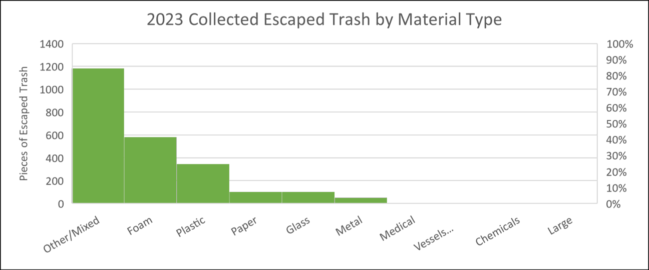 The collected materials were were made of majority plastic (51%). Bottle caps, food wrappers, grocery bags, and durable plastic food containers made up the majority of the escaped trash.