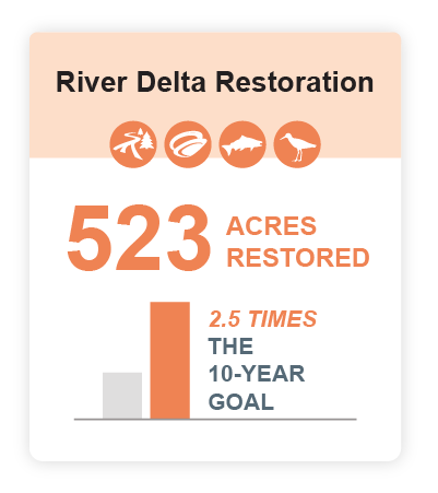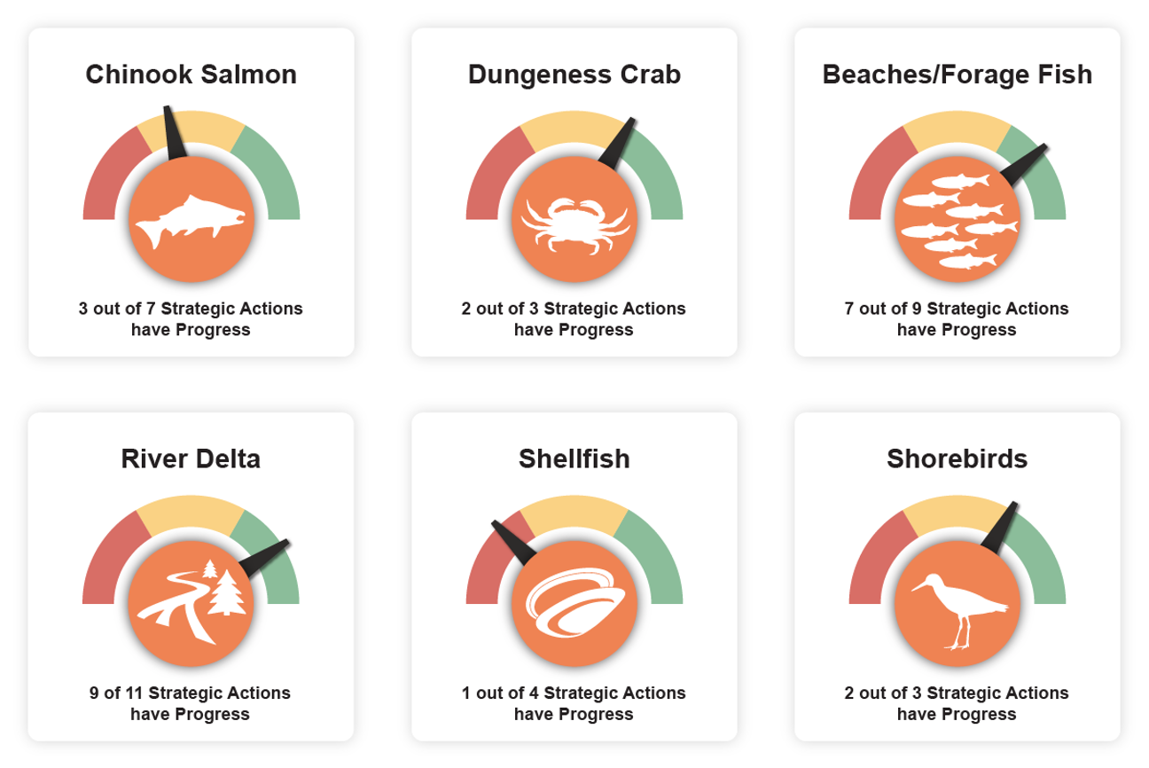 As part of the 10-Year Plan Revisit, Snohomish County MRC developed a Progress Tracker to document the level of progress made towards the strategic actions identified for each Conservation Target. The Progress Tracker Document helps partners in Port Susan understand the status of each Conservation Target and identify opportunities for future improvement. The graphics below provide a high-level snapshot of progress to-date; additional information can be found by downloading the Progress Tracker document.